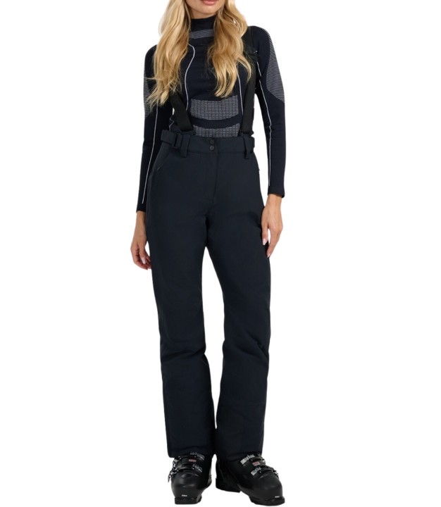 Functional features include detachable, adjustable braces and a Velcro adjustable waistband for a custom fit, along with internal snow gaiters to seal out snow. The trousers feature shaped knee areas and a regular fit for freedom of movement, and reinforcements at the bottom of the legs to increase durability. Practical details include side leg zips for easy boot fitting, 2 side zip pockets, a smooth lining, and reflective elements for improved visibility.