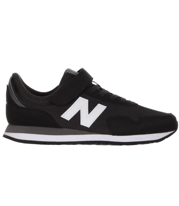 Stylish New Balance shoes in black mesh and faux suede with a large, white logo on both sides and a white midsole. The New Balance shoes have elastic lace at the front that cannot be adjusted. They are tightened with a Velcro strap over the instep. The inside is dark gray textile with extra padding around the opening. The shoes have removable insoles and a Fast heel cap. The outsole is made of a lightweight material with a tread pattern under the bottom, which ensures good footing.