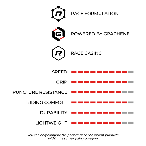 - Race Formulation, using Graphene + Silica compound, minimizes rolling resistance on the center strip and maximizes confident grip on the shoulders